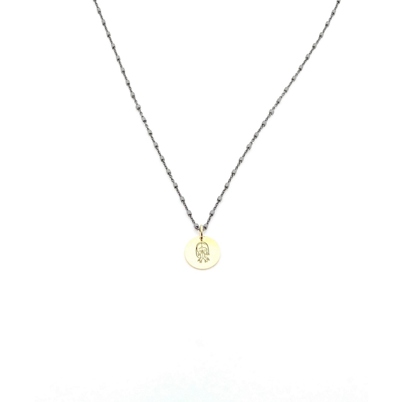 Colgante oro amarillo 18 kt ,diametro 10.5 mm con cadena de plata negra. Delante grabado Namaste , detras grabado Lokah Samastha Sukhino Bhavantu.