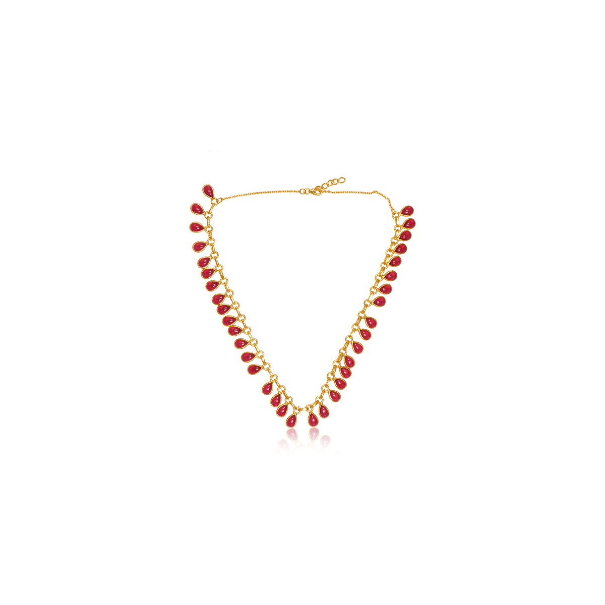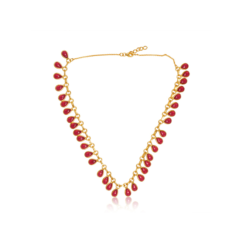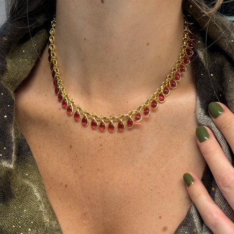 Collar plata dorada de ley con cristales forma pera color rojo.
